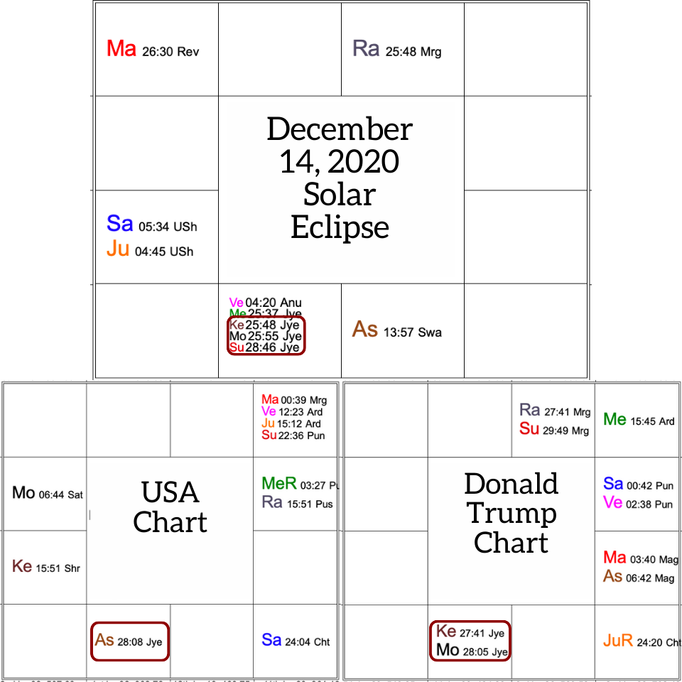 It Was an Eclipse Day - On this day there was a Solar eclipse, in Scorpio, in Jyeshta Nakshatra. This exact degree aligned with the ascendant of the US chart, AND the former POTUS, who had just lost, but did not want to concede to defeat. All 3 of them have either the Ascendant, Ketu or Moon at 28 Degrees of Scorpio.